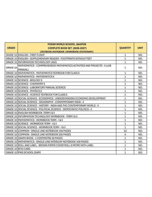 CBSE Grade 10 - (Podar World School Nagpur) (A.Y. 2026-27)