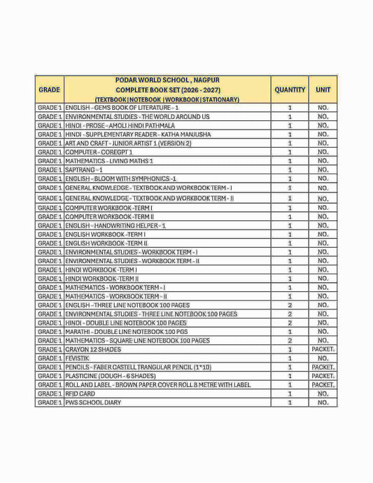 CBSE Grade 1 (Podar World School Nagpur) (A.Y. 2026-27)