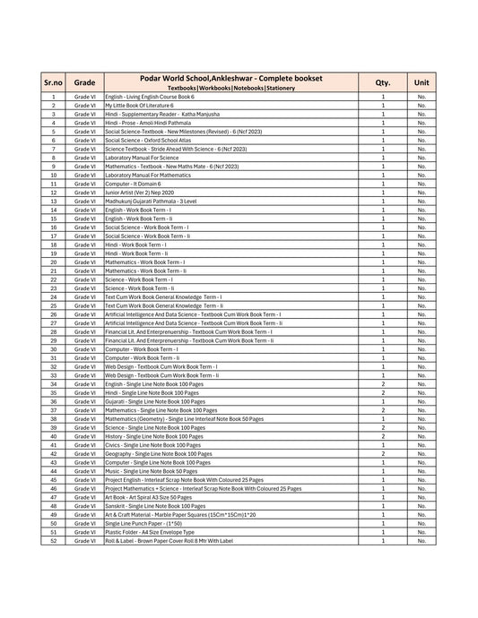 CBSE Grade 6 - (Podar World School Ankleshwar) (A.Y. 2025-26)