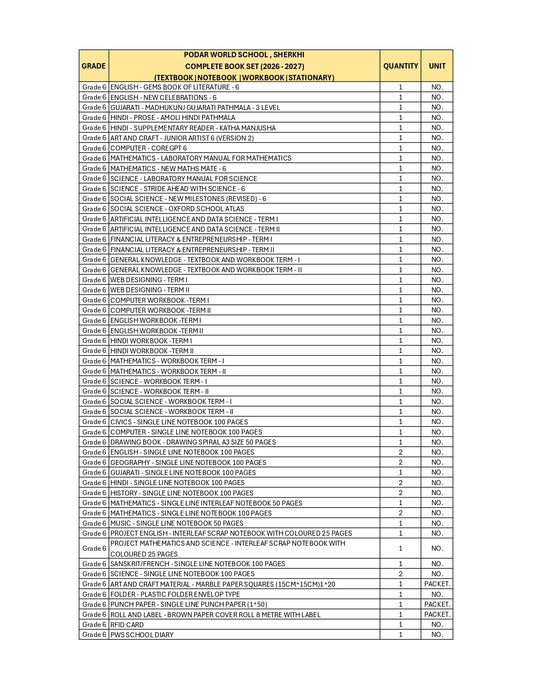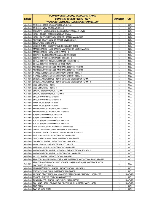 CBSE Grade 6 - (Podar World School Sama) (A.Y. 2026-27)