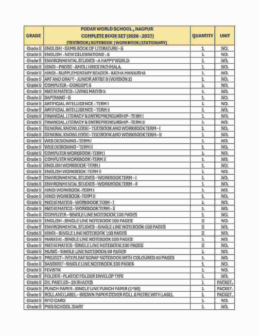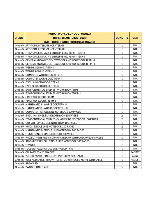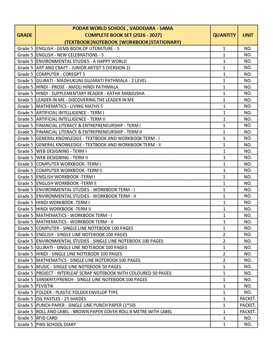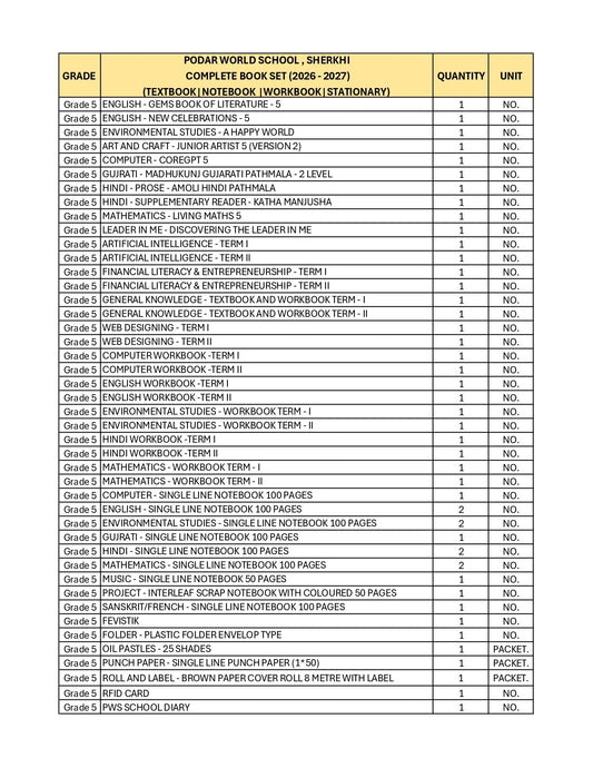CBSE Grade 5 - (Podar World School Sama) (A.Y. 2026-27)