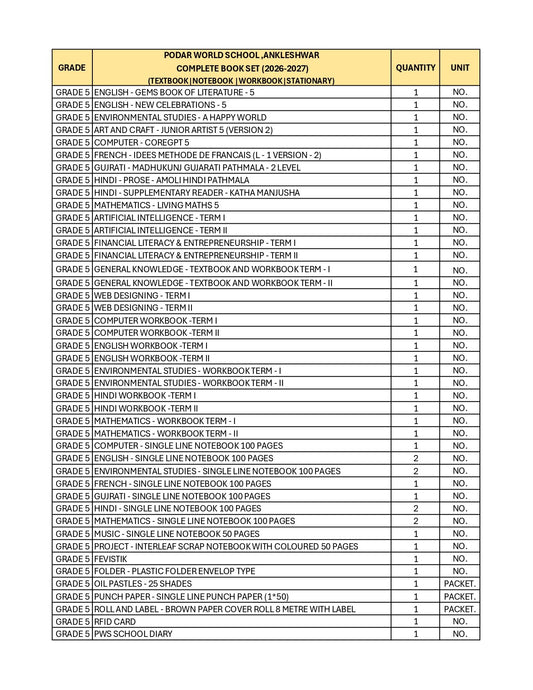 CBSE Grade 5 -(Podar World School Ankleshwar) (A.Y. 2026-27)