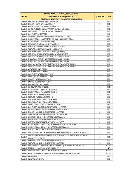 CBSE Grade 7 - (Podar World School Ankleshwar) (A.Y. 2026-27)