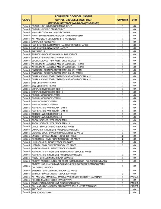 CBSE Grade 7 (Podar World School Nagpur) (A.Y. 2026-27)
