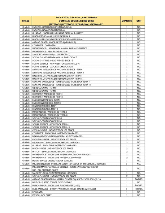CBSE Grade 6 - (Podar World School Ankleshwar) (A.Y. 2026-27)