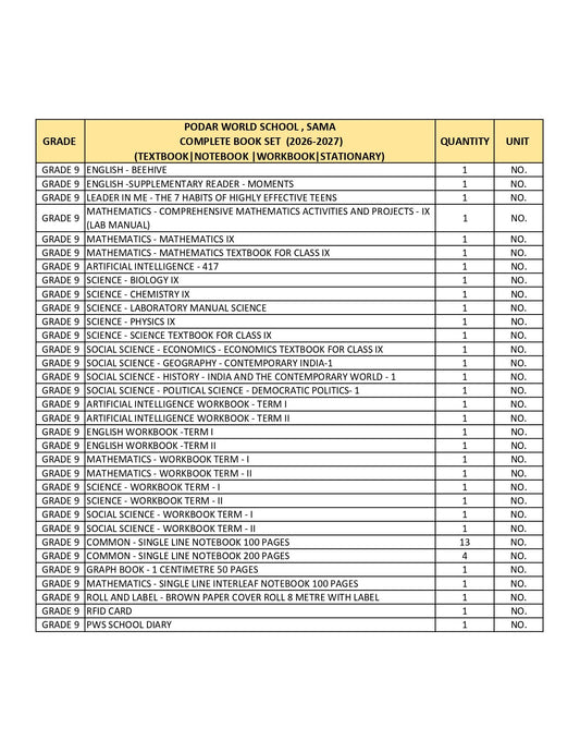 CBSE Grade 9 - (Podar World School Sama) (A.Y. 2026-27)