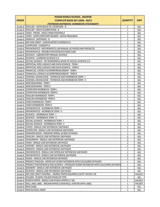 CBSE Grade 8 (Podar World School Nagpur) (A.Y. 2026-27)