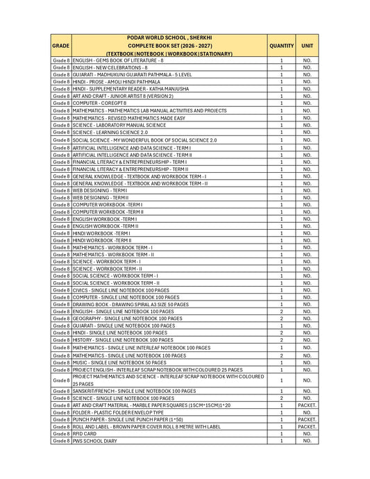CBSE Grade 8 - (Podar World School Sama) (A.Y. 2026-27)