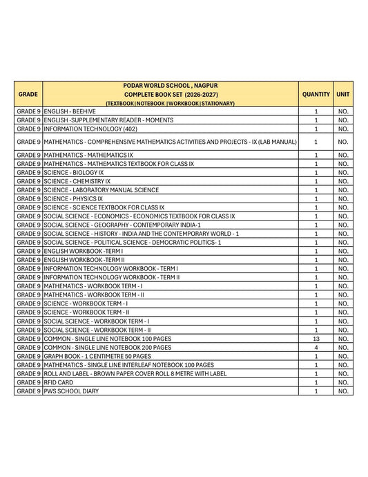 CBSE Grade 9 - (Podar World School Nagpur) (A.Y. 2026-27)