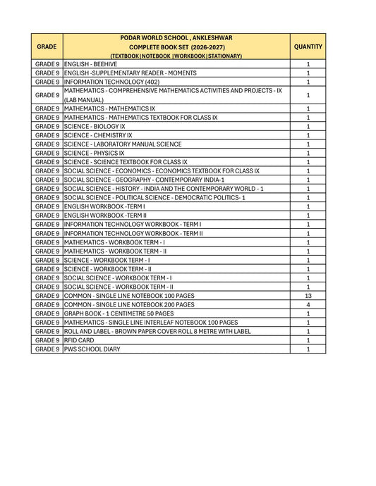 CBSE Grade 9 - (Podar World School Ankleshwar) (A.Y. 2026-27)